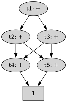 In this diagram, the terms represent a call to the binary addition operation + and one operand 1 is at the bottom. Notice that terms at the same level evaluate to the same result.